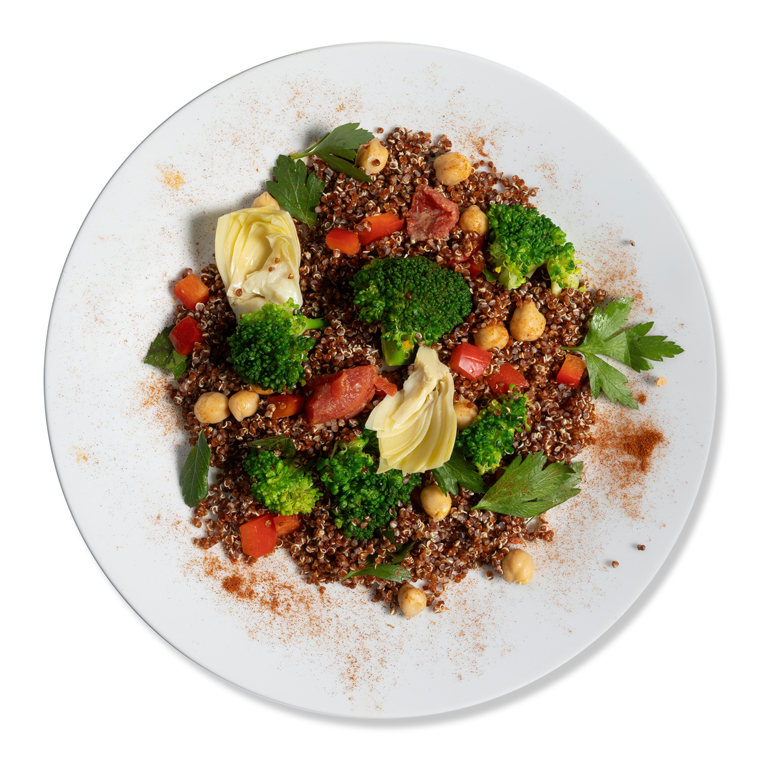 Spiced Quinoa (Quinoa, Olive Oil, Turmeric, Cumin, Cayenne Pepper, Ground Ginger, Coriander, Sea Salt), Broccoli, Red Peppers, Chickpeas, Olive Oil, Capers, Lemon Juice, Parsley, Sea Salt, Black Pepper, Artichoke & Tomatoes [Chickpeas, Tomatoes, Artichoke Hearts [Artichoke Hearts, Citric Acid, Water], Extra Virgin Olive Oil, Garlic]
