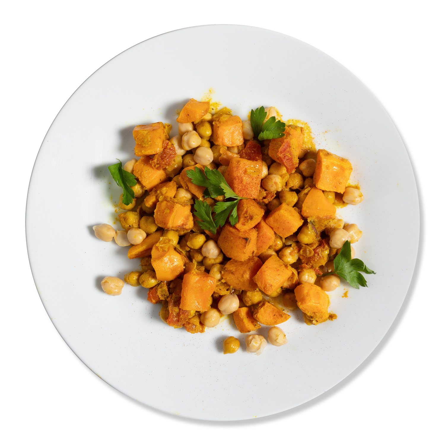 Moroccan Sweet Potatoes [Sweet Potatoes, Extra Virgin Olive Oil, Turmeric, Garlic, Sea Salt, Cumin, Black Pepper, Cinnamon, Caraway Seed, Allspice, Coriander], Chickpeas, Onion, Tomato Canned (Tomatoes, Tomato Juice, Calcium Chloride, Citric Acid), Lemon Juice